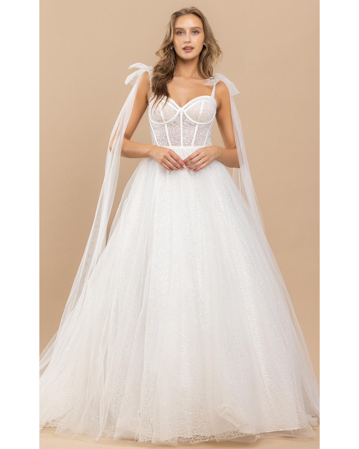 Tulle and bows are the quintessential elements of whimsical elegance and feminine charm. Tulle, with its sheer and delicate nature, adds an ethereal quality to any ensemble. It drapes, layers, and floats gracefully, creating a dreamy, almost magical effect. Bows, on the other hand, are symbols of sweetness and sophistication. Whether adorning a dress, wrapping a bouquet, or embellishing accessories, bows instantly infuse a touch of romance and playfulness. Together, tulle and bows create a harmonious combination that captures the essence of romance and adds a dash of fairy-tale allure to any wedding dress.
