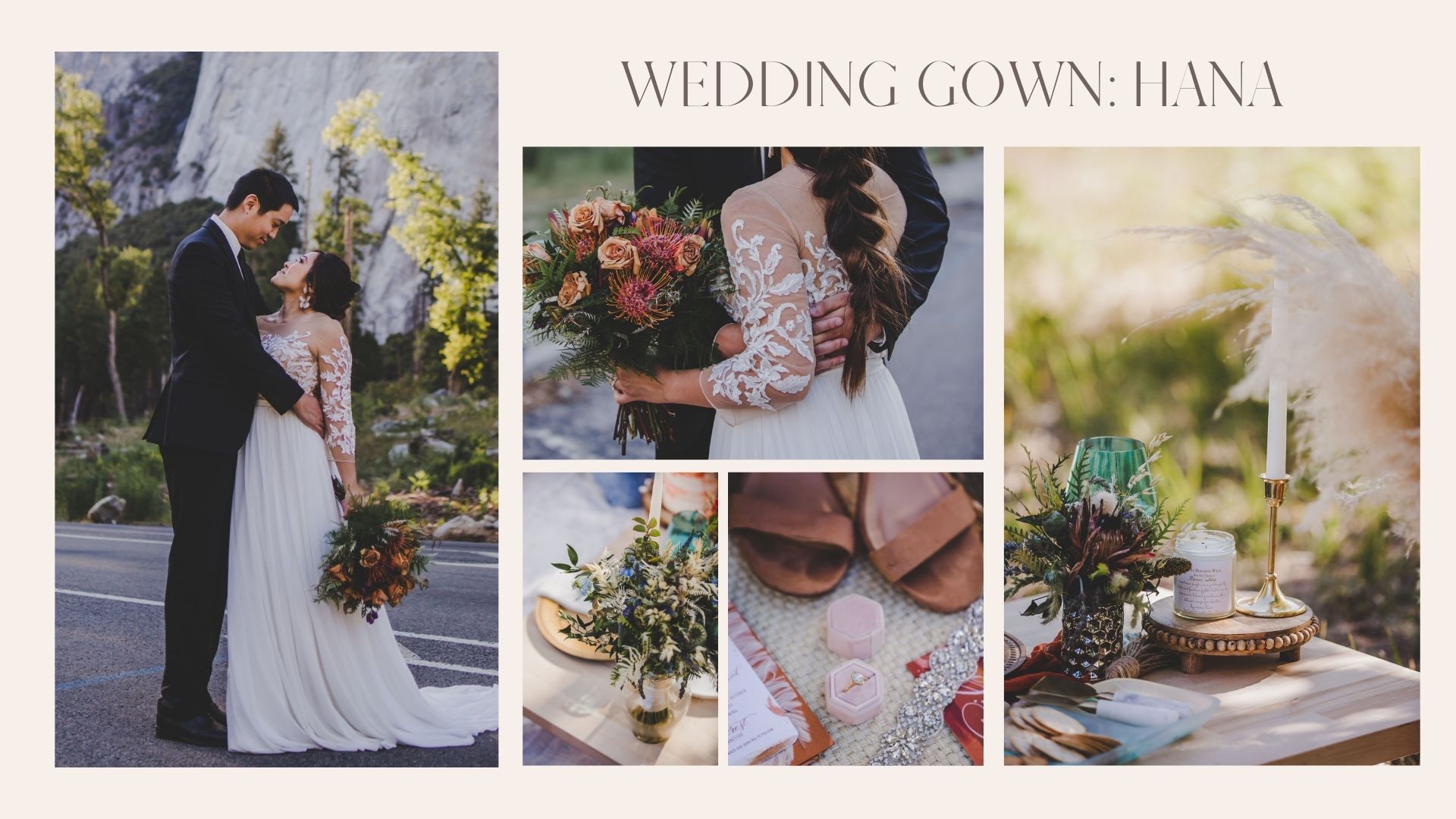 This styled shoot in Yosemite has the perfect blend of greens and earthy hues! Our bride is wearing our beautiful Hana dress, and what we love the most about this dress is that it's perfect for any kind of outdoor wedding. The clean and simple designs can easily blend into all kinds of settings which makes it one of the versatile styles in our collection.