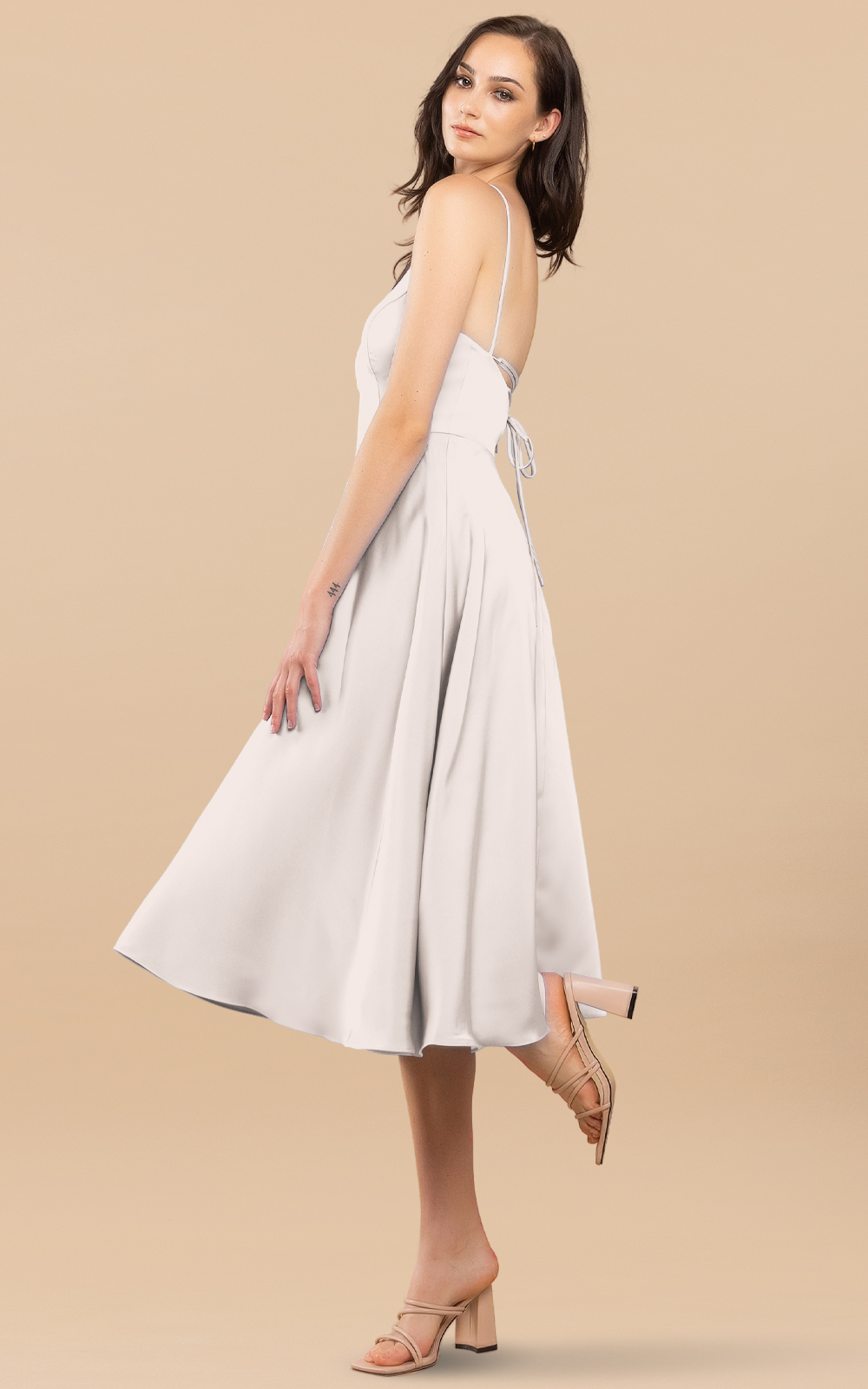 Tea-length is coming back in style! Discover our exquisite tea-length satin dress, a perfect blend of chic and playful look. The sleeveless design with a halter neckline exudes femininity. Step into sophistication by tuning your back! The low cut back has a removable straps for a ballerina tie back.