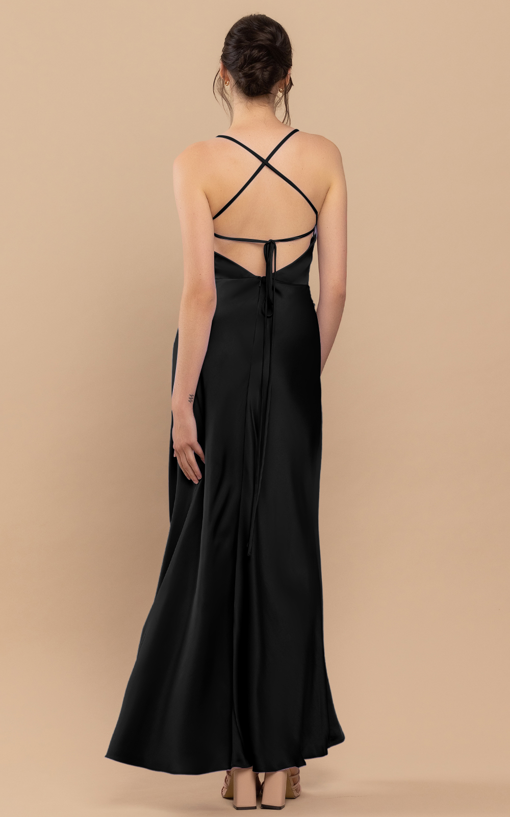Classic style with a little twist in details. Dawn is a floor-length ruched satin dress. Its asymmetrical neckline makes it a unique and sophisticated piece of art. The waist is embellished with ruched details, adding texture and visual interest. Its sheath-column silhouette flatters your figure and accentuates your curves. With a cross-strap detail at the back, the dress ensures a secure and comfortable fit. The dress features padding for added comfort, and the absence of boning allows for easy movement. Perfect for formal occasions and special events, this dress will make you feel confident and stylish.