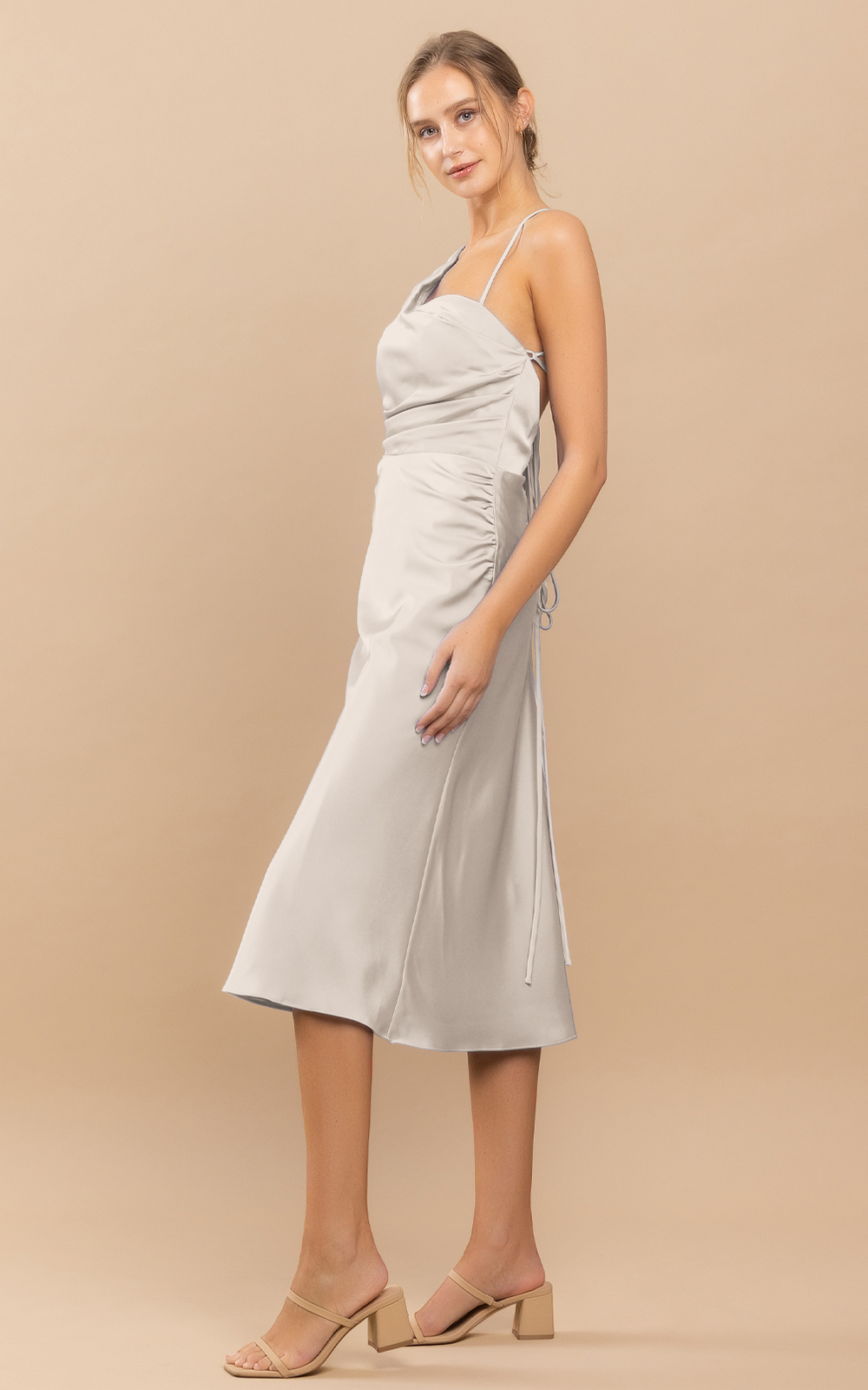 Classic style with a little twist in details. Dawn Midi is a tea-length ruched satin dress. Its asymmetrical neckline makes it a unique and sophisticated piece of art. The waist is embellished with ruched details, adding texture and visual interest. Its sheath-column silhouette flatters your figure and accentuates your curves. With a cross-strap detail at the back, the dress ensures a secure and comfortable fit. The tea length is very playful and perfect for any sleek and polished look!