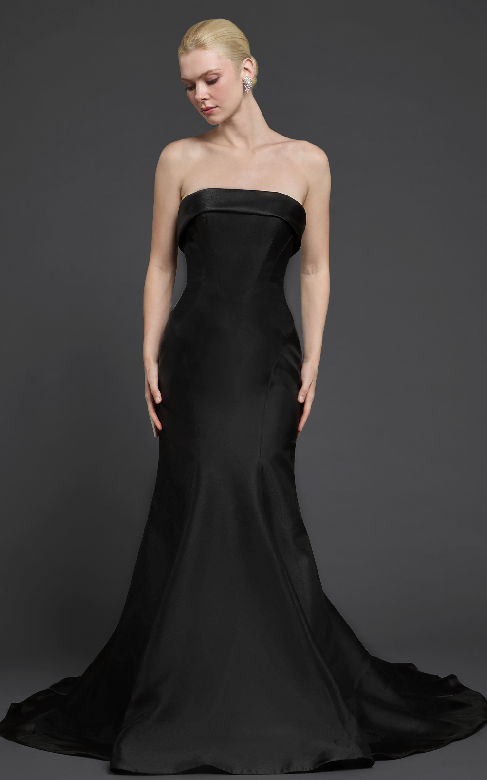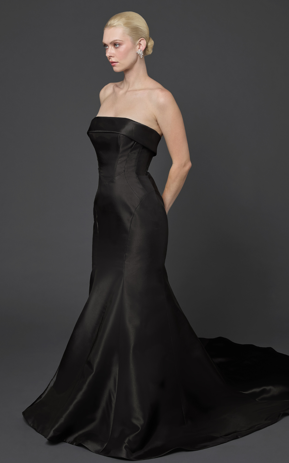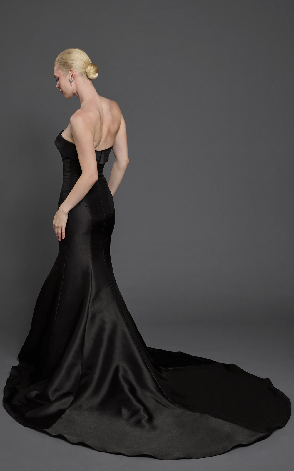 Make a bold entrance with Talia, the sleek black mermaid gown designed to show off every curve. Crafted in smooth, luxurious Mikado, this strapless beauty features a clean straight neckline and a dramatic cathedral train—perfect for brides who want a modern, unforgettable walk down the aisle.