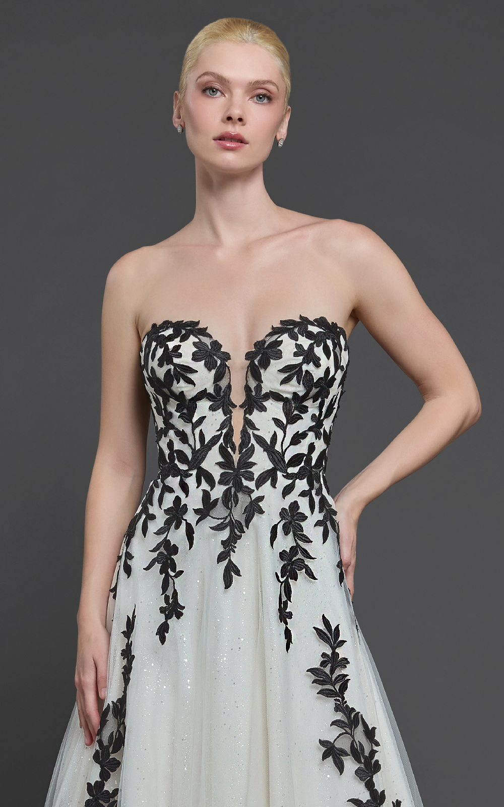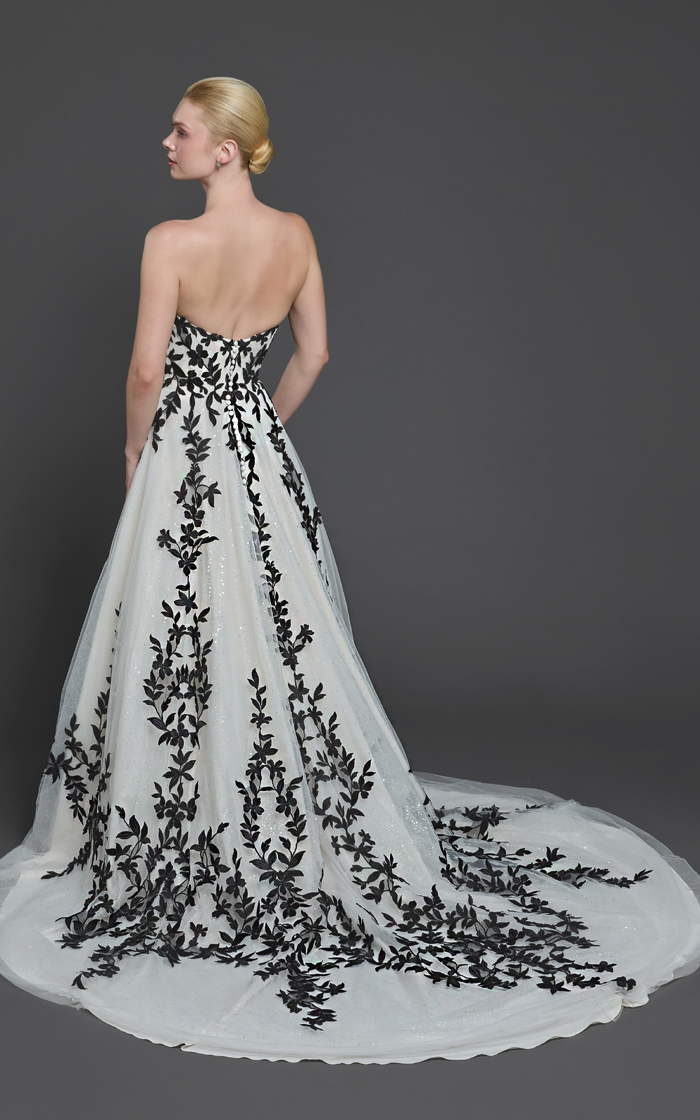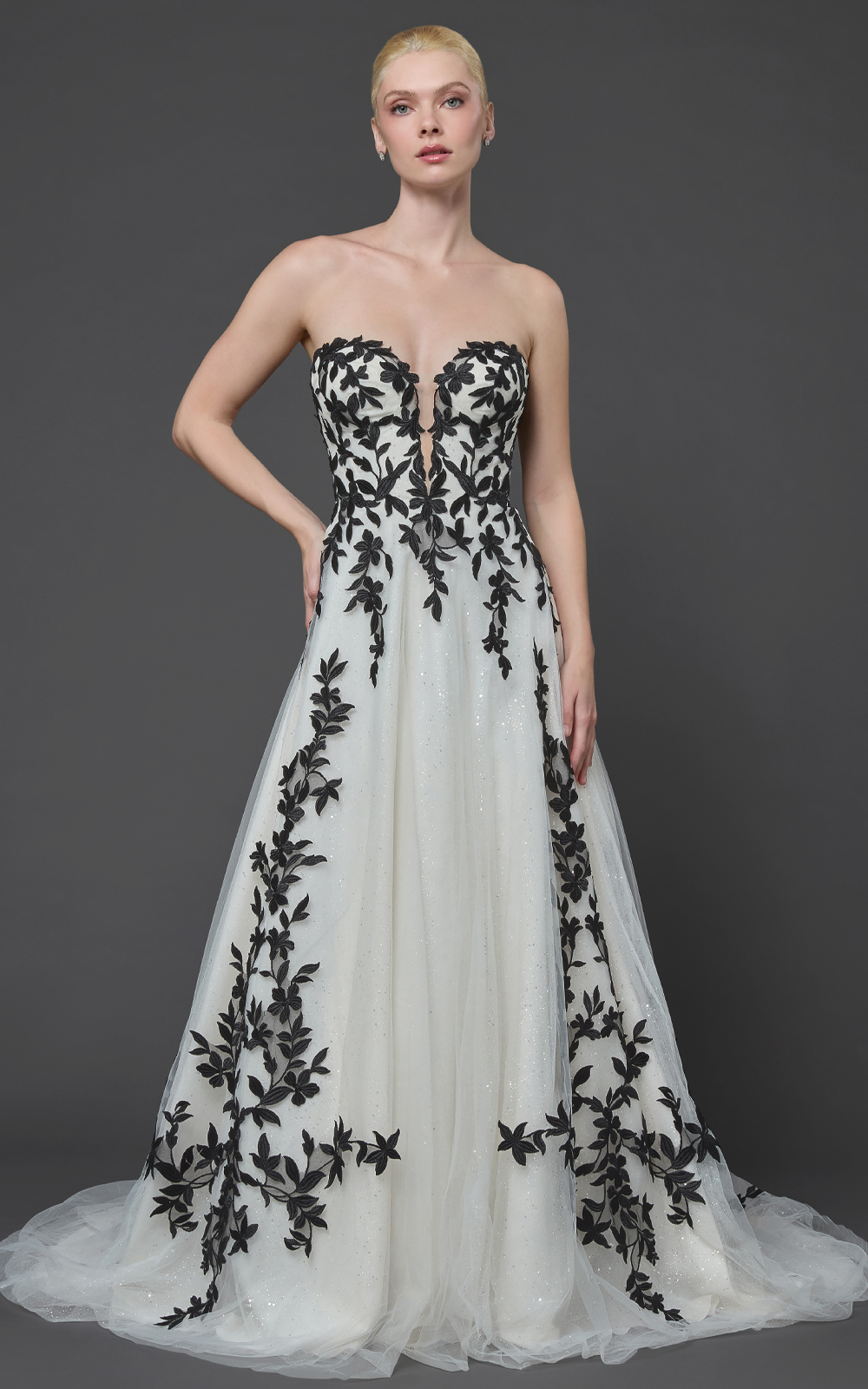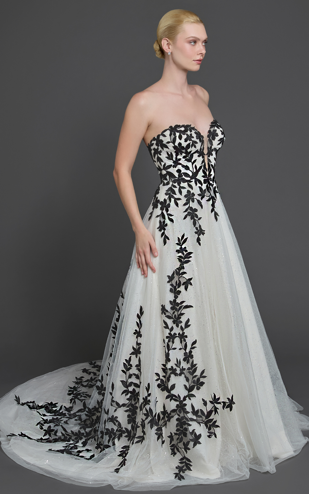 Celebrate your unique love story with Easton, a black-and-white A-line gown for brides who want a classic silhouette with a bold twist. Black lace adorns the sweetheart bodice and flows elegantly to the hem, while the dramatic cathedral train adds regal Victorian charm.