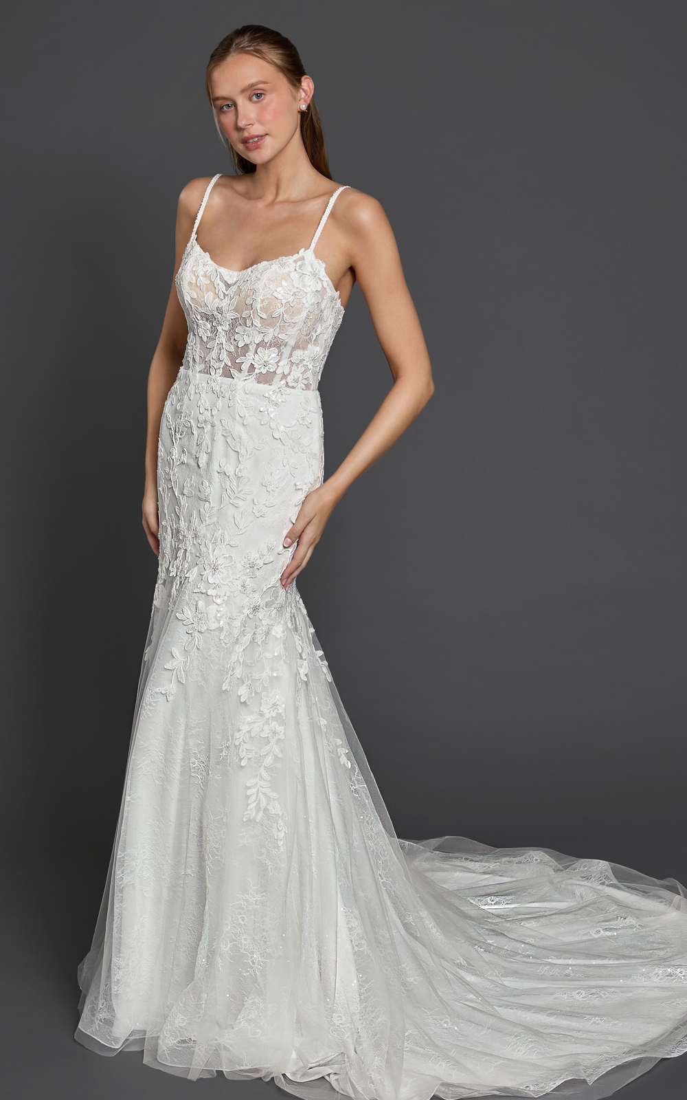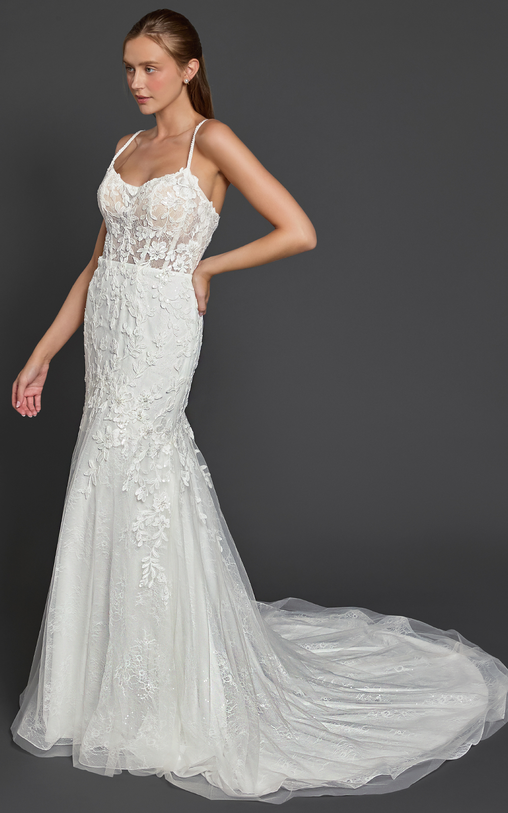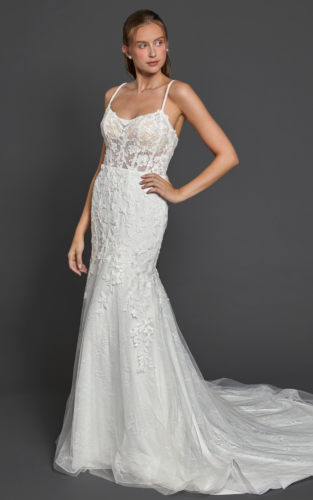 Meet Kenisha, a lace mermaid gown that blends romance with modern detail. The elegant square neckline is supported by lace-embellished spaghetti straps, while the illusion boned bodice sculpts and defines your curves. Sequined lace adds soft sparkle, and the floral embroidered mermaid “tail” creates beautiful texture and movement. Finished with a chapel train (customizable upon request), this gown is designed to make a statement.