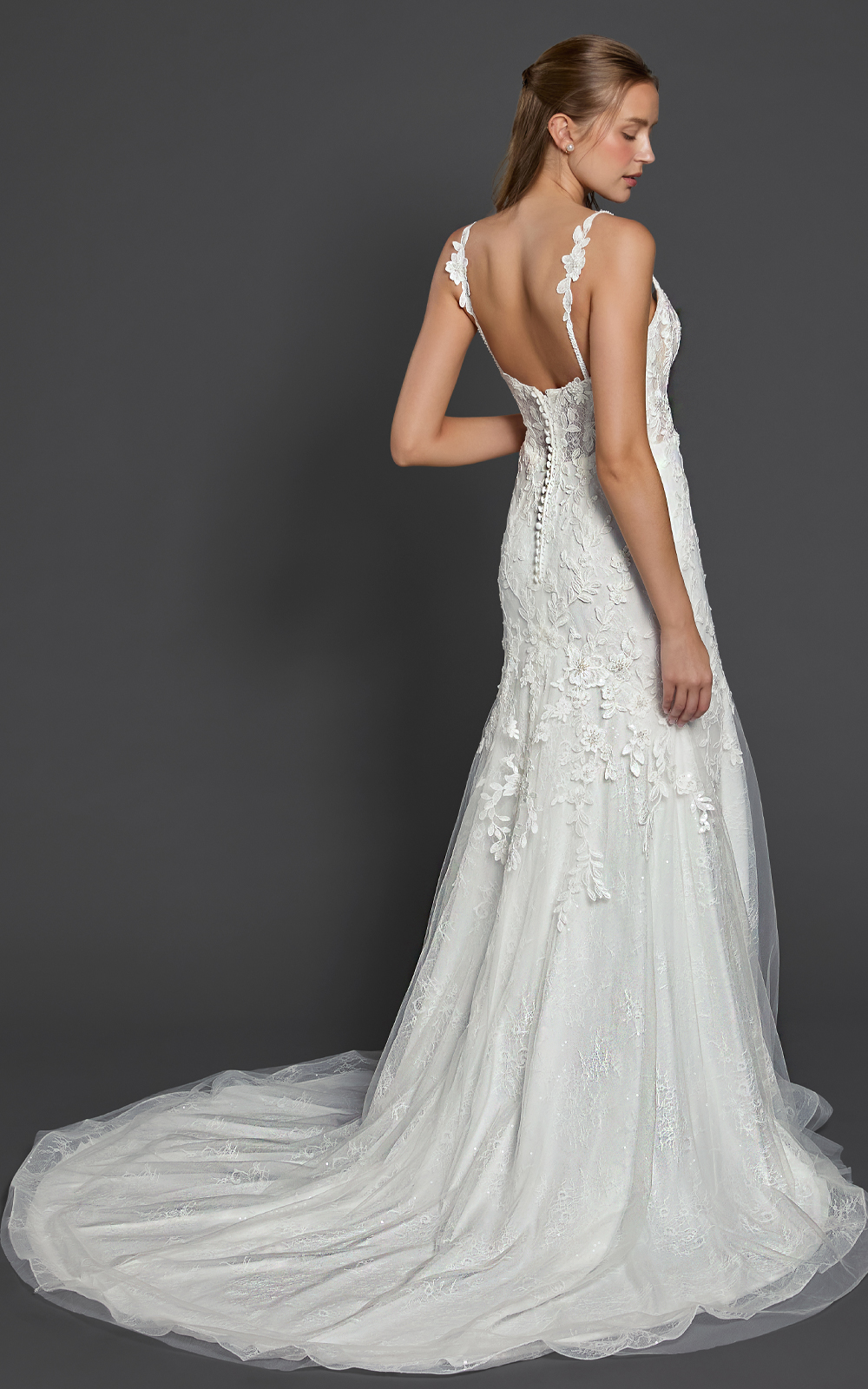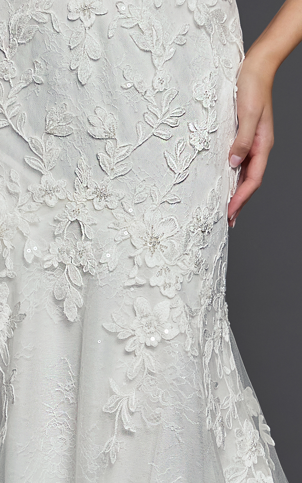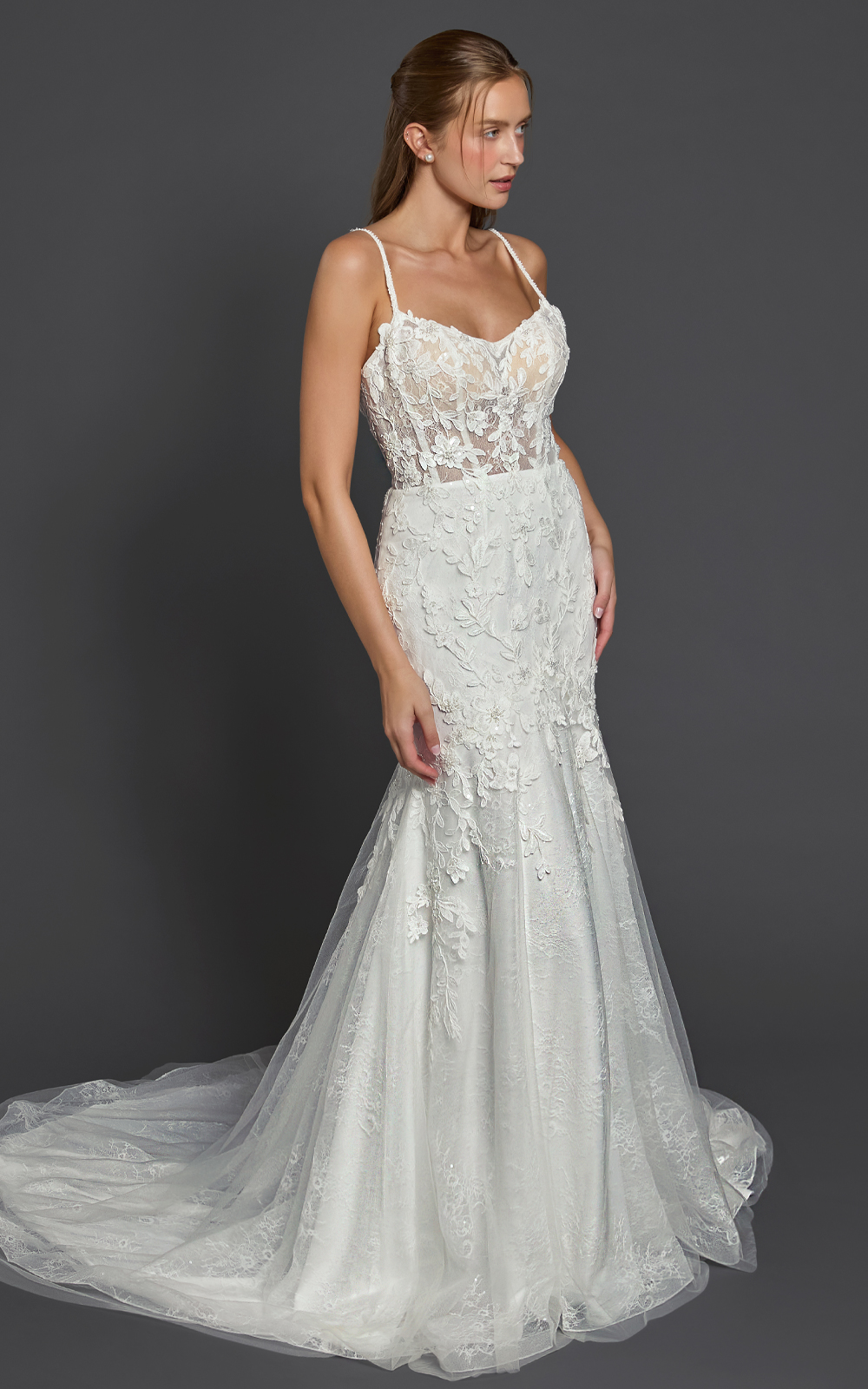 Meet Kenisha, a lace mermaid gown that blends romance with modern detail. The elegant square neckline is supported by lace-embellished spaghetti straps, while the illusion boned bodice sculpts and defines your curves. Sequined lace adds soft sparkle, and the floral embroidered mermaid “tail” creates beautiful texture and movement. Finished with a chapel train (customizable upon request), this gown is designed to make a statement.